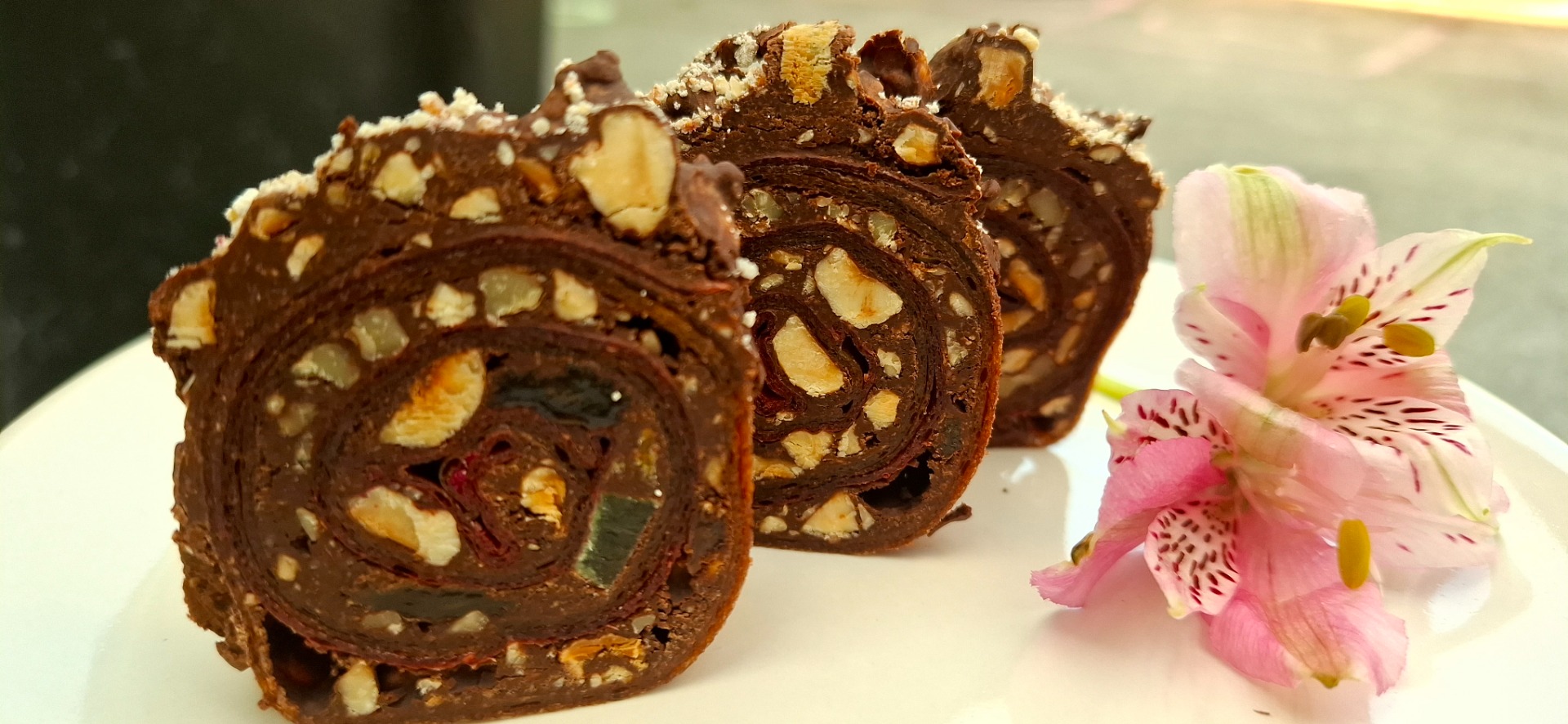 Gemaakt van witte chocolade en echte vruchten — een creatie van de vergeten alchemist uit het Bessenkasteel bij zonsondergang.